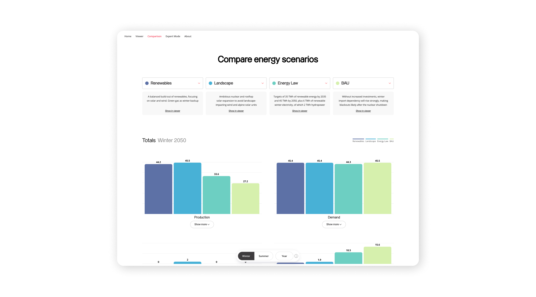 Based on these insights, we created simplified visualizations that highlight each scenario's key features against today's energy baseline. Users can immediately grasp the scale of change needed, for example, a 500% increase in wind turbines or varying assumptions about future energy demand. We expanded the tool with essential features: a comparison mode for side-by-side scenario analysis (requested by both Axpo and validated through our user interviews), interactive energy mix visualizations, a challenges section highlighting trade-offs, and transparent cost breakdowns. Special focus on responsive design ensures seamless use on both desktop and mobile.