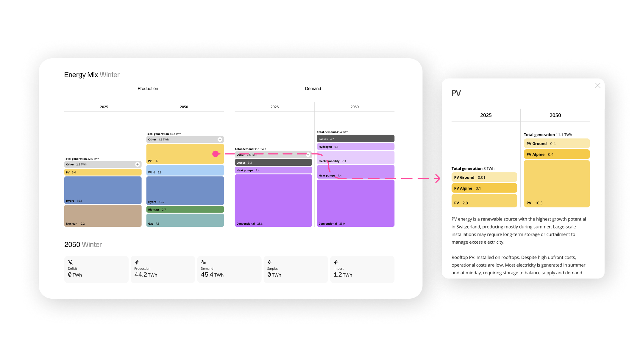 Through intensive expert interviews, we first developed a deep understanding of Switzerland's energy composition and its complexities. We then created and tested prototypes iteratively with energy professionals, learning which information matters most and how to visualize it effectively.